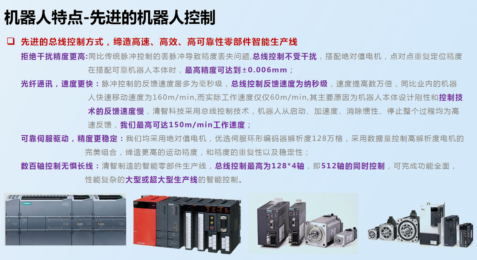 6、高精度:全系采用清智智能系統(tǒng)控制,采用NEX總線控制技術(shù)、閉環(huán)數(shù)字控制、搭配絕對值伺服電機(jī)解析度超過128萬格、采用光纖通訊技術(shù),反饋速度更快、控制運(yùn)算速度更快、搭配運(yùn)動差補(bǔ),整線實現(xiàn)重復(fù)點對點精度0.015mm